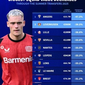 直播吧9月7日讯 《转会市场》统计了今夏转会窗过后的总身价下降比例情况,昂热居首,法甲7队在列。德转列今夏身价下跌比例榜...